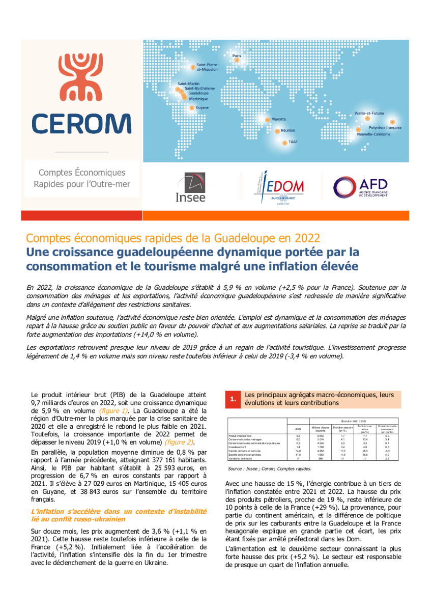 En 2022, la croissance économique de la Guadeloupe s’établit à 5,9 % en volume (+2,5 % pour la France). Soutenue par la consommation des ménages et les exportations, l’activité économique guadeloupéenne s’est redressée de manière significative dans un contexte d’allègement des restrictions sanitaires.