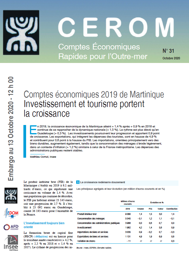En 2019, la croissance économique de la Martinique atteint + 1,4 % après + 0,9 % en 2018 et continue de se rapprocher de la dynamique nationale (+ 1,5 %). Le rythme est plus élevé qu’en Guadeloupe (+ 0,3 %). Les investissements poursuivent leur progression et apportent 0,9 point de croissance. Les exportations, qui intègrent les dépenses des touristes, sont en hausse de 4,9 % et contribuent pour 0,6 point à la hausse du PIB. Les importations, orientées principalement vers des biens durables, augmentent également, tandis que la consommation des ménages s’érode légèrement, dans un contexte d’inflation (+ 1,2 %) similaire à celui de la France métropolitaine. Les dépenses des administrations publiques restent stables.