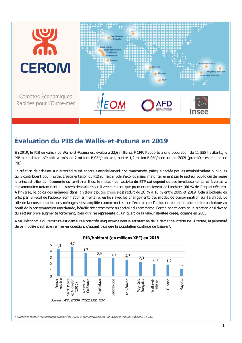 La création de richesse sur le territoire est encore essentiellement non marchande, puisque portée par les administrations publiques qui y contribuent pour moitié. L’augmentation du PIB sur la période s’explique ainsi majoritairement par le secteur public qui demeure le principal pilier de l’économie du territoire. Il est le moteur de l’activité du BTP qui dépend de ses investissements, et favorise la consommation notamment au travers des salaires qu’il verse en tant que premier employeur de l’archipel (66 % de l’emploi déclaré). À l’inverse, le poids des ménages dans la valeur ajoutée créée s’est réduit de 26 % à 16 % entre 2005 et 2019. Cela s’explique en effet par le recul de l’autoconsommation alimentaire, en lien avec les changements des modes de consommation sur l’archipel. Le rôle de la consommation des ménages s’est amplifié comme moteur de l’économie : l’autoconsommation alimentaire a diminué au profit de la consommation marchande, bénéficiant notamment au secteur du commerce. Portée par ce dernier, la création de richesse du secteur privé augmente fortement, bien qu’il ne représente qu’un quart de la valeur ajoutée créée, comme en 2005.